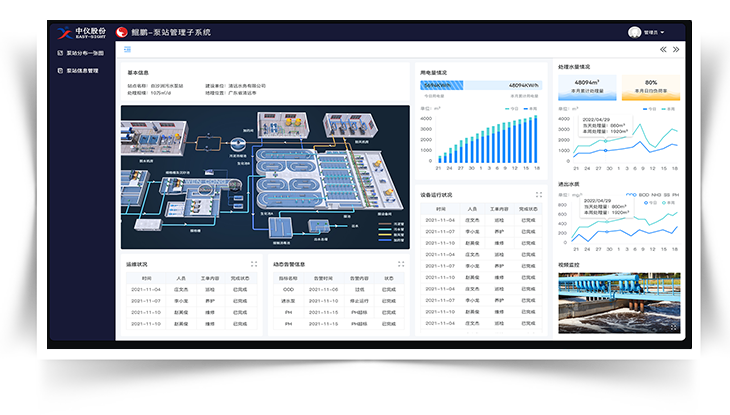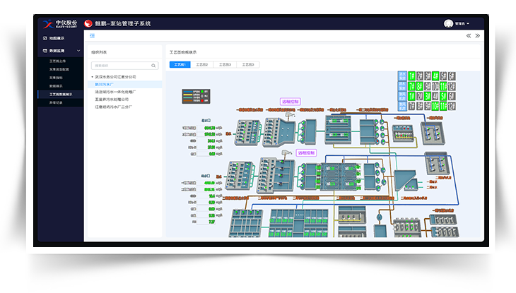 综合运用数字李生、智能控制等技术手段,并与污水厂自动化、智能化控制系统集成,进一步提高污水厂与农村污水处理站的精细化管理水平,实现污水处理工艺流程和设备运行状态的可视化表达,为厂一站一网的一体化调度提供技术支撑。